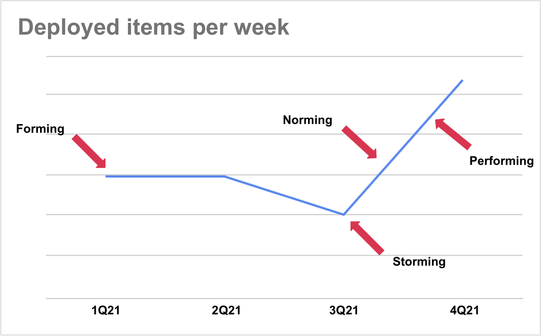 In 2021, after making the transition to a predominantly internal team, the team went through Tuckman’s stages in a clearly visible way. In the first quarter, the team was forming, with people still getting to know each other, learning to work together, and understanding the objectives. In the second quarter, productivity remained stable but still low. In the third quarter, the team stormed: the number of items deployed per week dropped, conflicts increased, and processes were being adjusted. In the fourth quarter, the team normed and started to perform. Productivity rose significantly.